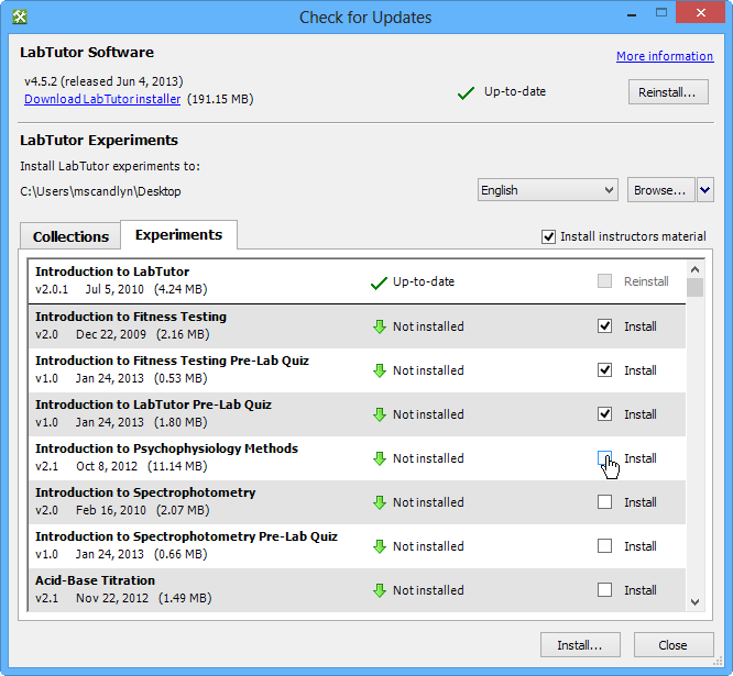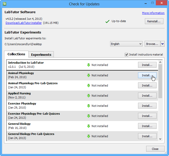 There are 2 ways to obtain LabTutor Experiment installers - by downloading directly from the LabTutor Server Administration pages, or through the Check for Updates utility (which is installed on your computer along with LabAuthor).