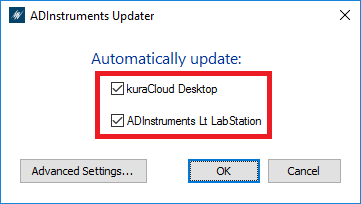 When the LabStation Application / kuraCloud Desktop Application is installed, a small utility called the ADInstruments Updater will be installed. Running this utility (which requires Admin Privileges) will allow the user to disable updates for the LabStation Application / kuraCloud Desktop Application: