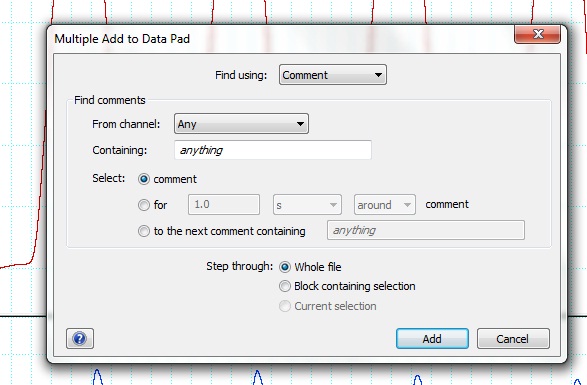 If only the comment time and full text is required, The other option is to use LabChart's Data Pad and the Multiple Add to Data Pad feature to export a text file that only contains the required information. To do this you will first need to setup the Data Pad by left mouse clicking on the appropriate Data Pad columns, setting one column to display the comment time, and a second column to record the full comment text from the correct channel. Once the Data Pad columns are setup, go to the Commands Menu, and select 'Multiple Add to Data Pad...' To add the comment times and full text to the Data Pad you will need to configure the Multiple Add to Data Pad Settings Window as shown in the image below.