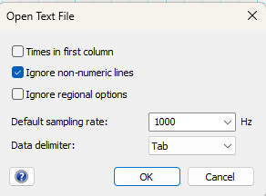 Times in first column: Ensure this box is unchecked. Spike2 text files do not include a time column; LabChart will create the correct time axis using the sampling rate you provide below.