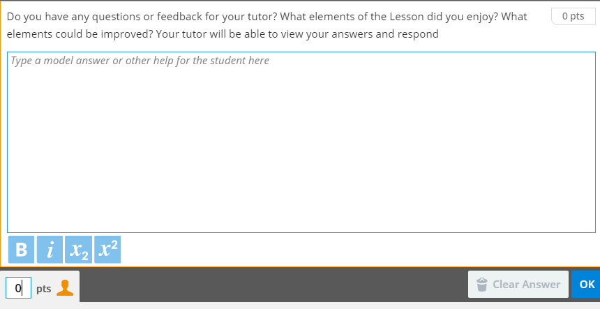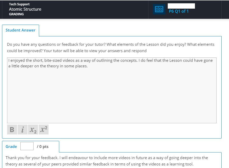The feedback Student(s) type into the Question will then appear in the Grading Interface of Lt. This not only allows the Educator to view the feedback, they can also respond using the Grading Interface's Feedback option: