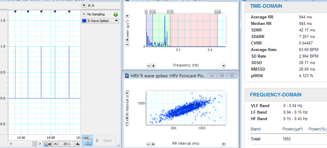 The Wireless Heart Rate Kit will output a 1 Volt pulse for every heart beat, and these pulses can be detected and automatically analyzed in both the time and frequency domains within LabChart's HRV Analysis module.