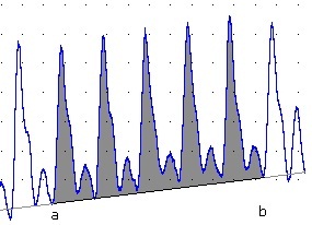 Integral relative to Baseline: Displays the integral of the selection, calculated as the sum of the data points minus the value on a baseline (drawn from the value at the start (a) to the value at the end (b) of the selection), multiplied by the sample interval. This can be useful with a steadily drifting signal: in the example below, Integral above Baseline is an approximation of the shaded area.