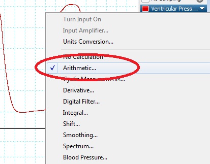 These sections are due to LabChart waiting to acquire the minimum required data samples for the calculation's basic algorithm and user-defined settings. LabChart can be instructed to interpolate from the first/last good calculation values to the beginning/end of the file with the Arithmetic Channel Calculation's Nanremover function. To apply the Nanremover function to a specific channel's data, select the Channel Title Bar in a new channel and follow the Channel Calculations Menu path illustrated below.