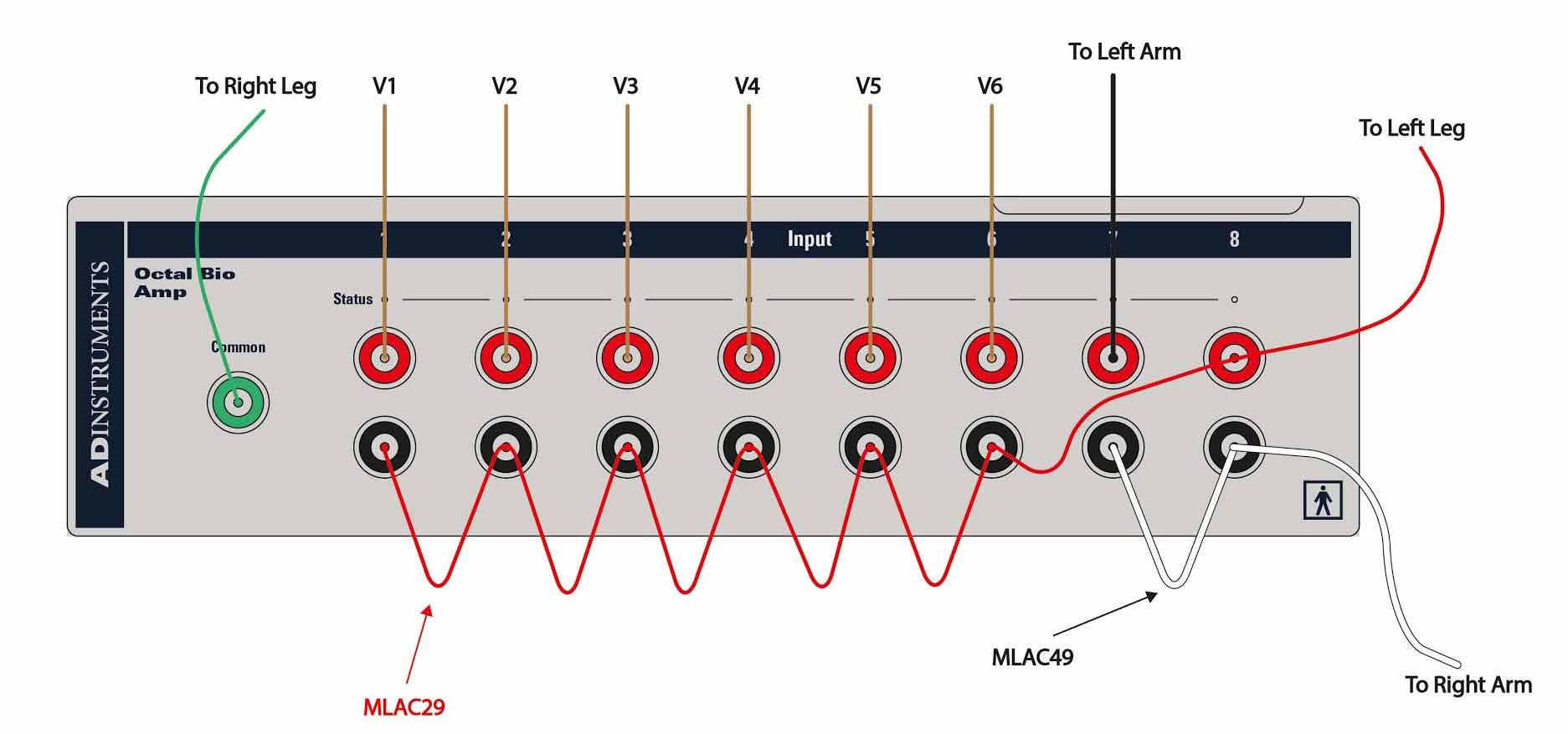 Please note, the MLAC49 linking cable has two extra 1.5mm touch proof plugs that will not be used with this configuration. These plugs can remain unplugged and hanging free from the linking cable during its use. The MLA0311 Lead Wires can now be connected to the linking cables and bio amp inputs as shown, and connected to the appropriate recording sites on the subject with MLA1010 ECG Electrodes.