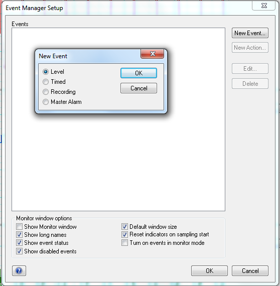 Next go to the Setup Menu>Event Manager... This opens a blank Dialog where you can start adding events to monitor and actions to perform. Click on 'New Event' and select 'Level'