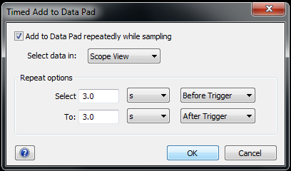 The Scope View will update dynamically as you record data, and additionally you can add data to the Data pad continuously using the Timed Add to Data Pad option from the Setup Menu. In the dialog that appears, select Add to Data Pad repeatedly while sampling and choose select data in ScopeView.