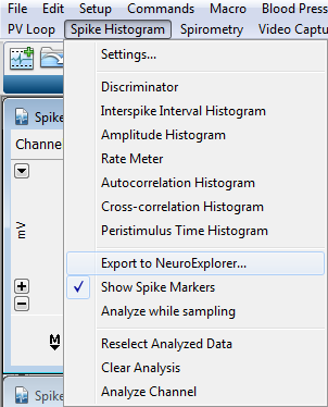 The Spike Histogram Module is able to directly export data in the native NeuroExplorer file format (.nex), which can be read directly with NeuroExplorer. The option to Export can be located under the Spike Histogram menu when the module is enabled in LabChart: