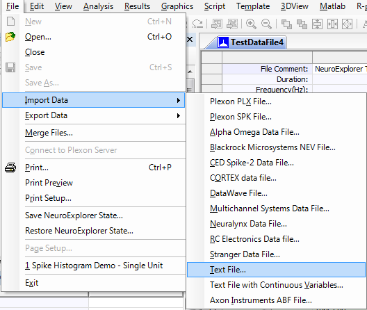 To open .txt files with NeuroExplorer, select 'File' --> 'Import Data' --> 'Text File', and navigate to the text file of interest: