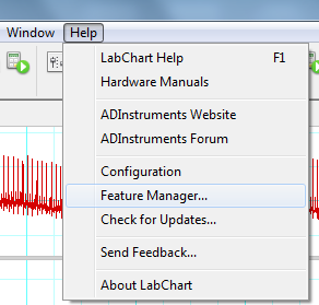 You can access the Feature manager by clicking on the 'Help' Menu and selecting 'feature manager'.... (under 'LabChart' menu in the Mac version)