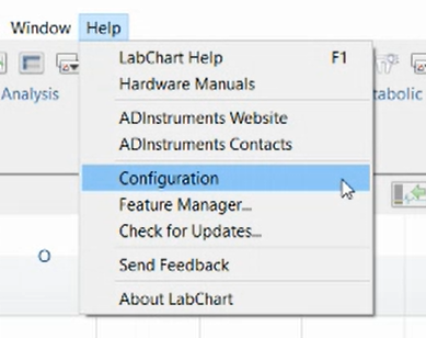 You can determine which version of LabChart was used at the time when a data file was recorded by using the mouse to left click the Help Menu and select the 'Configuration' option.
