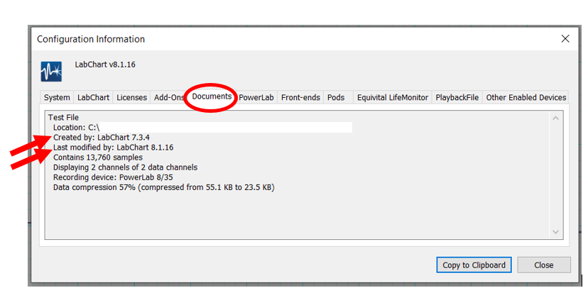 From there, click on the 'Documents' tab to display software information for the data recording, such as the version used when the file was created (ie. Created by:) and/or the version used when it was last modified (ie. Last modified by:)