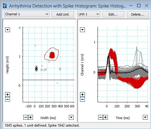 Next, open the Discriminator from the Spike Histogram menu in LabChart. Note that there should be two main clusters of beats on the left side of the Discriminator plot: one group of normal ECG beats and one group of arrhythmic beats. When you click on individual beats (marked by x's) on the left side of the Discriminator, the selected waveform will be highlighted in black on the right side of the Discriminator. You can mark a group of beats "arrhythmic" by drawing a circle around the beats on the left side corresponding to an arrhythmia shape on the right side (see the red circle on the left side of the Discriminator below) and clicking "Add Unit."