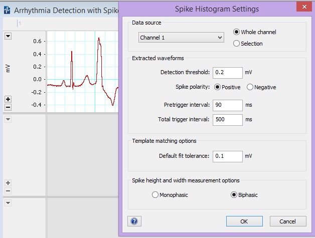 Although the Spike Histogram Module for LabChart was initially designed to discriminate extracellular neural spike activity, the pattern-matching features can detect specific waveform shapes within any data. To use Spike Histogram to see arrhythmia shapes within an ECG waveform, set up the detector by accessing the Settings dialog within the Spike Histogram menu. Use a detection threshold that will find both normal and abnormal ECG beats, and use trigger intervals long enough to include the entire ECG heartbeat.