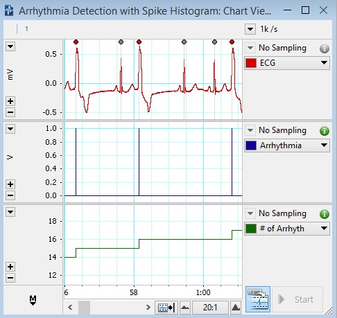 After adding the unit of arrhythmic beats in the Discriminator, the instances of arrhythmia in the Chart View will each be marked by a red dot.