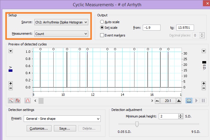 If you are displaying Unit Spikes, you can then use the Cyclic Measurements channel calculation in a new channel to keep a running count of the arrhythmia events by selecting Cyclic Measurements from the new channel's menu and choosing the Count calculation with the unit spikes channel as the source.