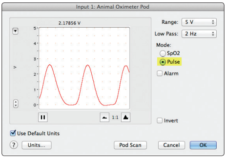 If you are using one of our Animal Oximeter Pods to measure from an animal with heart rate at or below 450 BPM, you can view a pulse signal rather than the SpO2 reading by accessing the Oximeter Pod dialog from your channel menu dropdown, and selecting "Pulse." You can't view both at the same time though.