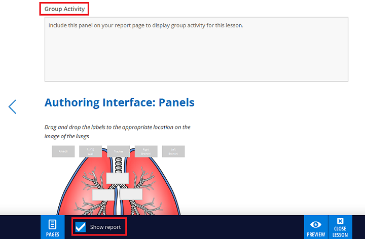 The Group Activity Panel will automatically be added to the Report on the Completion Page of a Lesson. To display this, make sure the Report is set to be shown on the Completion Page - this can be done by opening the Lesson as an Admin to Edit it (Lessons | Lesson of Interest | Open), and on the Completion (final) Page, check the the 'Show Report' Checkbox: