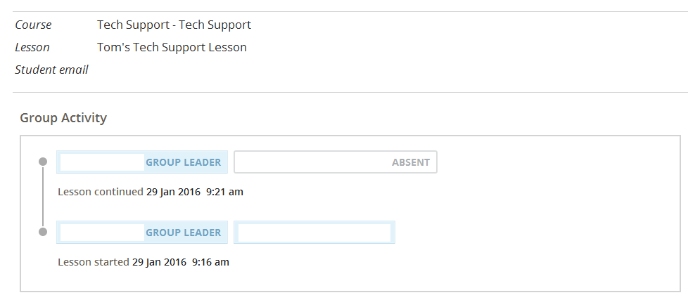 Lt actively tracks Group Activity, more specifically Group Branching. There are 2 ways to view Group Activity - on a Lesson's Completion Page, or on the final page of a Student's Answers within the Grading Interface.