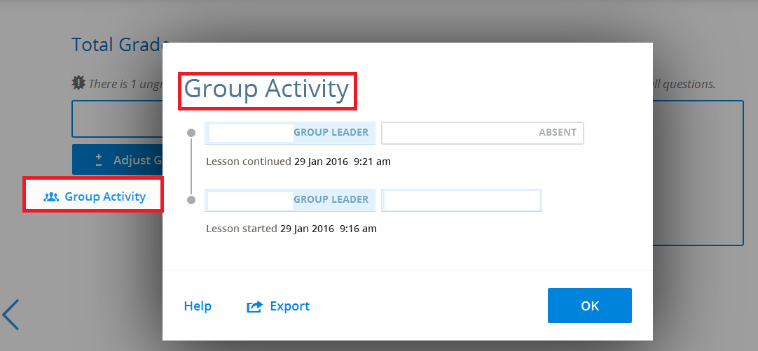 In the Grading Interface, the 'Group Activity' button will be available on the final 'Summary' page of a Student's Answers - click the button to view the Group Activity associated with the chosen Student: