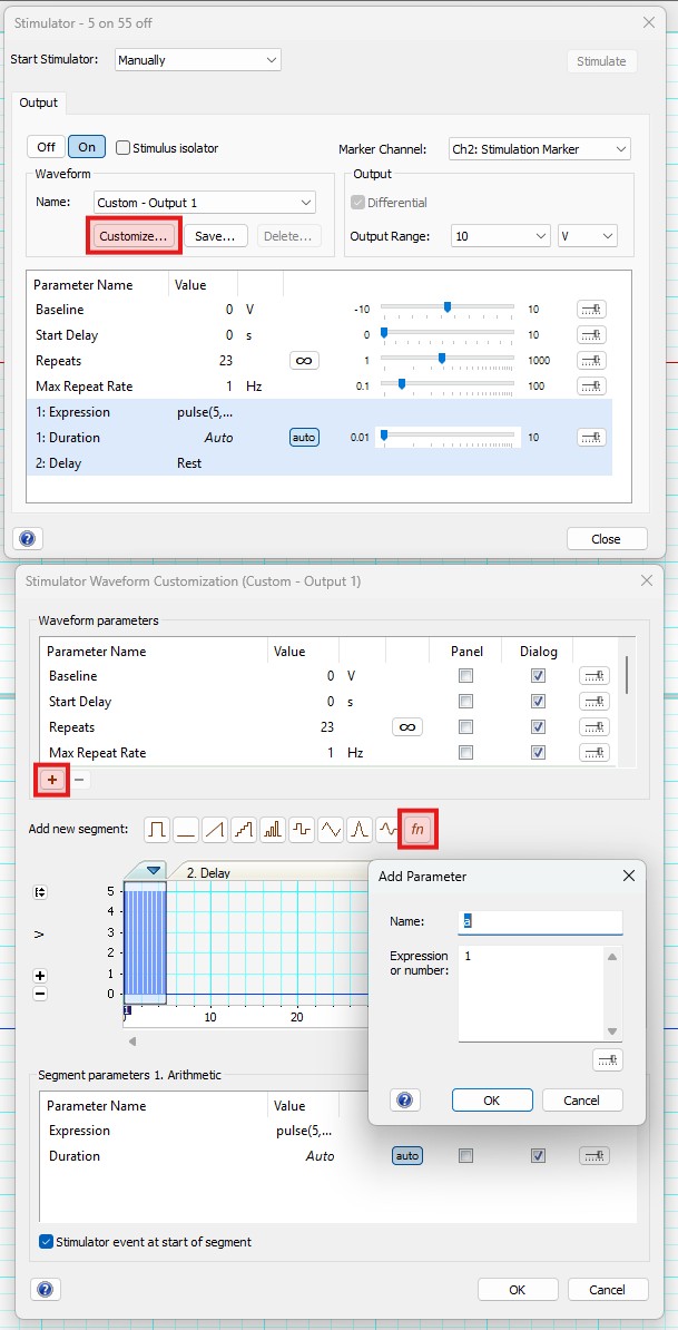 First, open the Stimulator window (Setup > Stimulator), select Customize…, and then click the + button to add custom parameters. These parameters can then be referenced when adding an arithmetic expression parameter (fn). Note that the arithmetic expression option is not available for isolated stimulation.