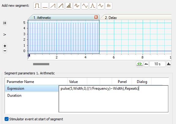For example, if you want 5V amplitude pulses to occur within a total duration of 5 seconds, at a specific frequency, you would create an arithmetic expression segment using: