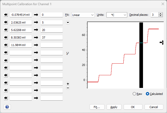 For each temperature, highlight a selection of the plateaued data and select the arrow on the left side of the dialog. This will enter the voltage value into the first box. Apply the relevant temperature in the right-hand box on the same line. When you have done this for each temperature, select the unit of choice (e.g. °C), select a suitable line fit, and then select Apply. Recordings made with your temperature probe will now read out the correct temperature.