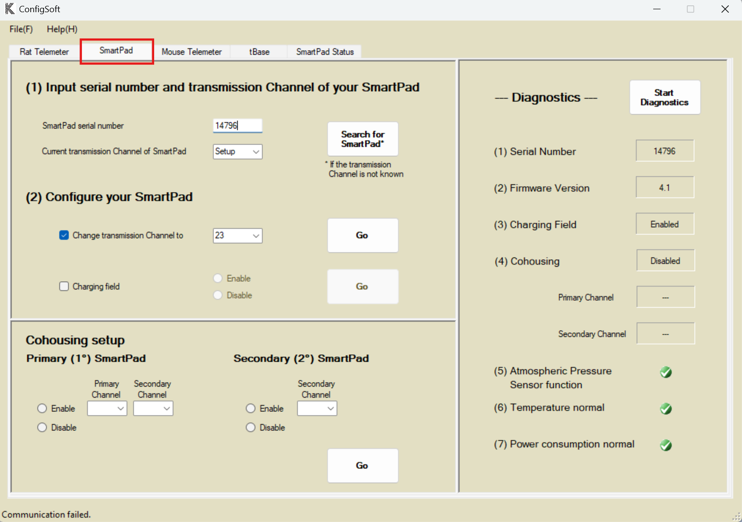 - If the current Transmission Frequency is unknown, click Search for SmartPad. The Configurator will search for and report the Transmission Frequency for the Serial Number entered.
