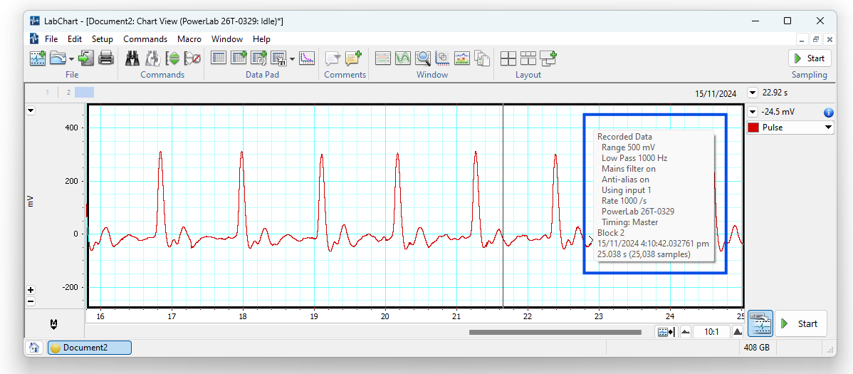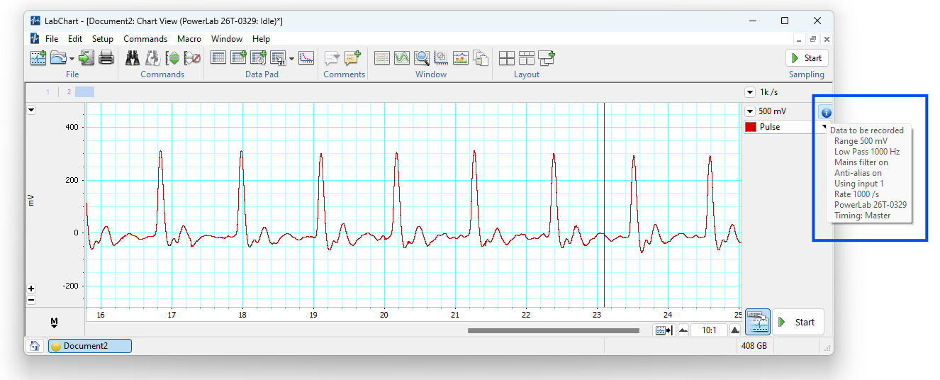 Select and hold the left mouse button in the data channel for more extensive details about the recording settings. This will display a small dialogue about the sampling rate, recording range, unit conversions or channel calculations, and the time, date, and number of sampling points in the recording block.
