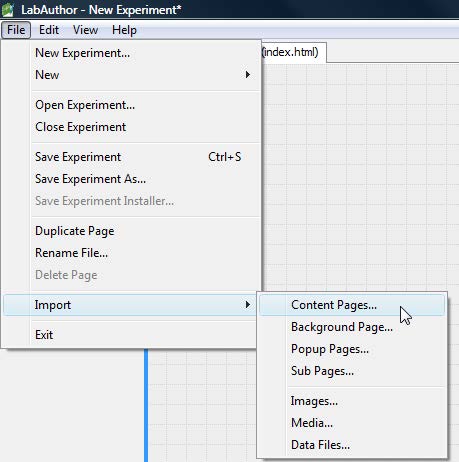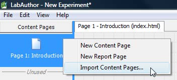 LabAuthor allows you to import content pages from other experiments. In LabAuthor go to the File menu / Import / Content pages... or right-click anywhere in the Content Pages section and select Import Content Pages...