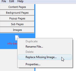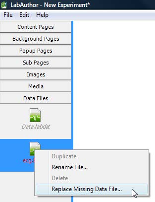You can add these missing files by going to the relevant section (Data Files or Images sections) and right-clicking on the missing file, highlighted in red. Simply navigate to the correct file - images are all in the Images folder of the experiment (or the 'Extras / Images' folder if it is within a Sub-page), data files are all within the LabTutor_pieces folder.