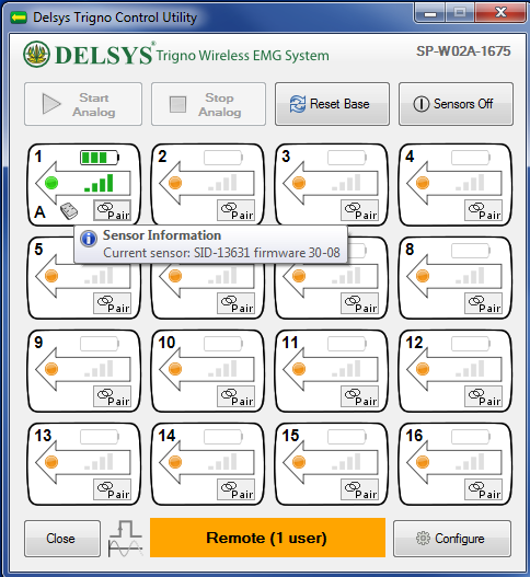 Each Delsys Trigno Sensor has a unique System Identification (SID) Number. This, and the firmware version, can be found after you pair the sensor in the Trigno Control Utility by hovering the mouse over the sensor icon that appears: