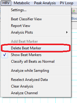 You can then select 'Delete Beat Marker' from the HRV menu and the beat marker will be removed and the intervals recalculated accordingly. NB this option will be greyed out if a selection is not made.