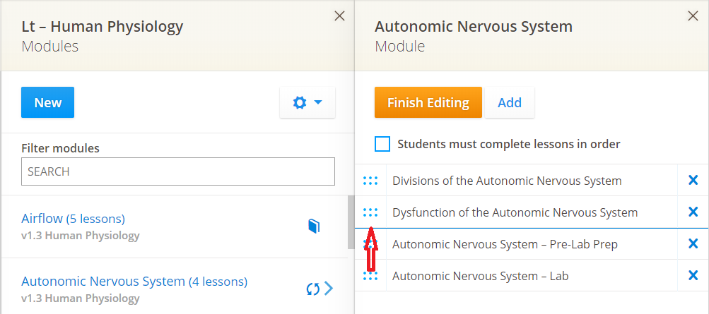 Hover over the set of 6 blue dots at the side of a lesson, click and hold and drag up or down to change the position of that lesson - a blue line will show you where the lesson will go before you release. Select 'Finish Editing' to exit: