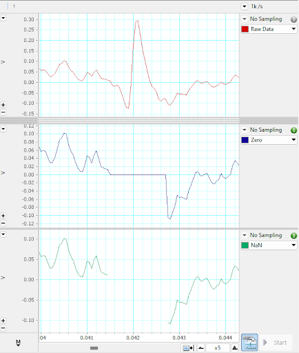 It is also possible to manually select regions to remove rather than based on y-axis thresholds. The approach also uses the Window(x, y, z) function, yet regions of data to be set to 0 can be identified with start and end points, e.g. from 5s to 7s. The signal (x) is SampleTime, which plots the time in seconds from the beginning of the block. As the desired data becomes 0, this must be inverted, hence, the function has a negative sign at the beginning of each Window() function. All Window() functions for each unwanted region can be added and multiplied with the source channel. For example: