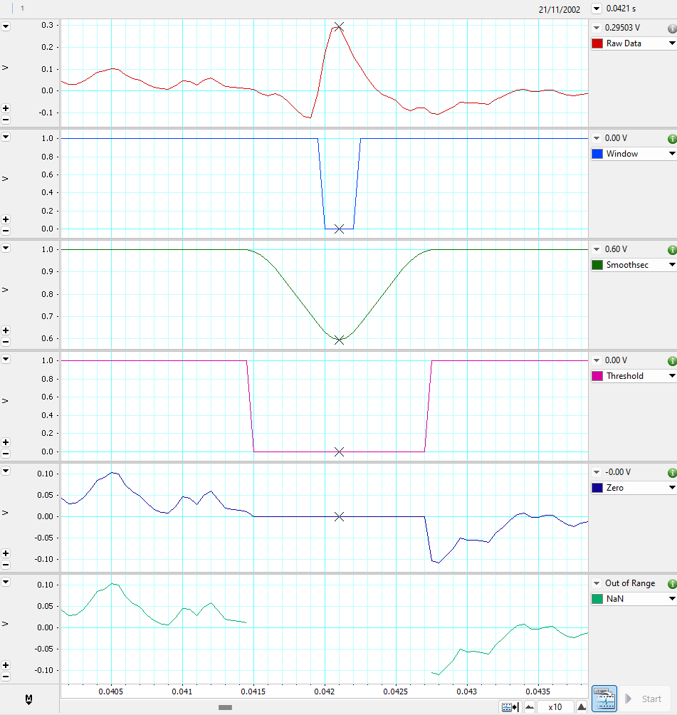 In summary, the Window(x, y, z) function defines the upper and lower limits for data to be designated 1V or 0V. Smoothsec(x, seconds) adjusts the width of the region to how much data you want to remove. Threshold(x, y) recreates the binary aspect of the signal, i.e. 1V for the desired portion or 0V for the undesired portion. The next step is multiplying the data with the source channel so that the desired portion remains as is because it is multiplied by 1, while the undesired portion becomes 0 as it is multiplied by 0:
