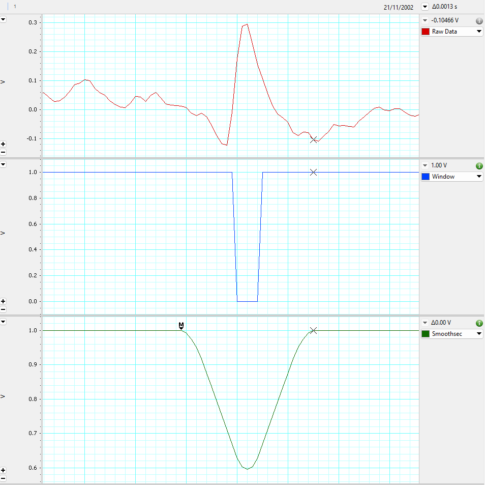 Smoothsec(x, seconds) performs smoothing, essentially a moving average, on the source data (Window(ch1,-1,0.11)) using a triangular window. In the example, this elongates the gap between the marker (M) and cursor by 0.001 seconds to 0.0013 seconds.
