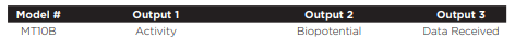 All tBase analog outputs are low pass filtered at 1kHz. Once paired with a telemeter on the same transmission frequency, the tBase will automatically detect the model of the telemeter it is communicating with. tBase analog outputs are then configured to the following signal outputs: