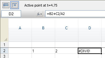 #DIV/0!: This error is mainly present when entering a formula into the Data Pad, and arises where one or more parts of the formula are trying to divide by zero (in the below example, the formula in D2 is trying to divide by A2, which contains no data). To resolve this, check that all referenced cells in the formula contain numerical data: