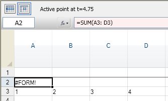 #FORM!: This error relates to the formatting of a formula - some part of the formula is in the incorrect format. This can be caused by accidental spaces, commas or hyphens that do not match the expected syntax of the formula. In the below example, there is a space in the data reference after the colon - this is not correct formatting, the second cell reference must come immediately after the colon, without a space. Check that your formula is written in the correct format: