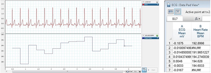 For example, in the image below we are trying to calculate the mean heart rate from channel 2 in column 2 of the data pad for intervals of one second. As there are not enough data points to perform the calculation at the beginning of the data file and at the end of the data file in channel 2, datapad is returning “#NUM “ value in the first and last cell of the Heart Rate Mean column.