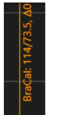 The Systolic pressure of the reBAP signal (averaged over 10 beats prior to the BraCal) is subtracted from the Systolic measured value calculated by the arm cuff (averaged over 2 measurements). When the subtraction is done, the Delta (∆) value shows the difference between the actual measured value and the reBAP value calculated from the finger cuff. After the BraCal is complete, a marker is added to the channel, showing the average arm measurement (Systolic and Diastolic pressures) and the Delta (∆) value. In the picture below, the delta value is zero.
