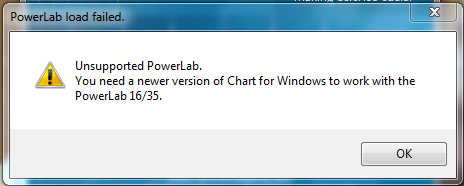 If you run Chart 5 on your Computer and connect a 35 Series PowerLab to it you will see a warning message: