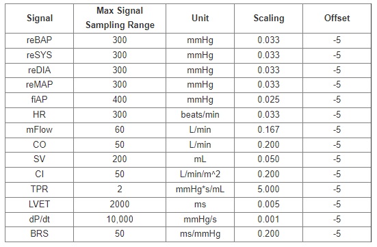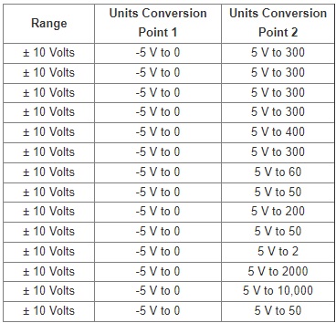 The corresponding values for each parameter that should be used when setting up the LabChart Units Conversion Feature are located in the table below: