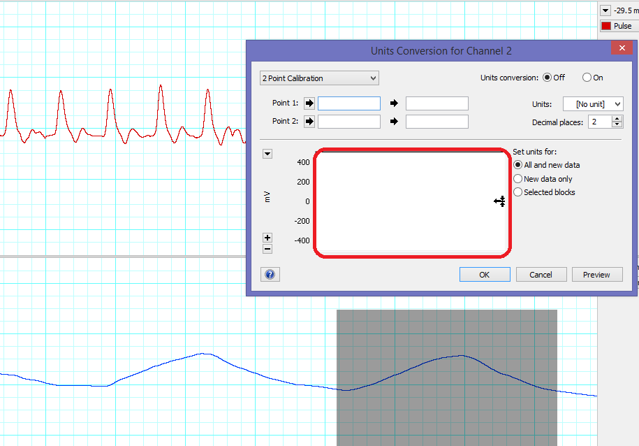 The data in the Units Conversion Window can appear skewed (or even not appear at all) when LabChart is set to sample at different rates from different inputs - this is a known issue with LabChart for Windows: