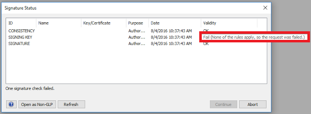 This error is caused when trying to open a GLP File signed by a user on a different GLP Server setup than the one on which this file is being opened. To open a file generated by a user on an other GLP Server, you'll need to add them to your GLP Server.