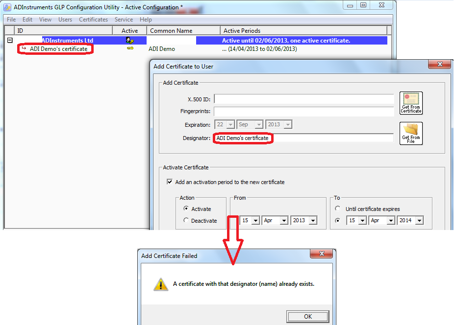 However, one additional stipulation is that the new certificate for a given User must have a different name (designator) from any other certificates for that User. Trying to add a certificate with the same name will result in the described error: