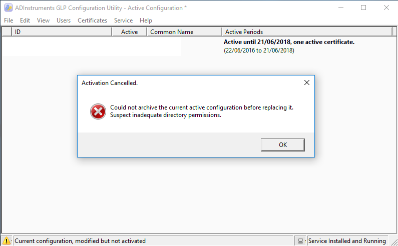 ADInstruments' GLP Server requires full Administrator rights in order to make changes to the GLP Configuration. This error actually indicates that you have insufficient privileges to apply the new configuration:
