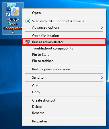To resolve this, exit the GLP Server Configuration utility. Then, right-click the utility and click Run as Administrator: