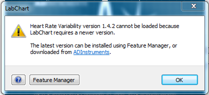 It is not possible to use HRV 2 with LabChart 7. Likewise, it is impossible to use HRV version 1 with LabChart 8. You will see a warning message advising an upgrade to the latest version.